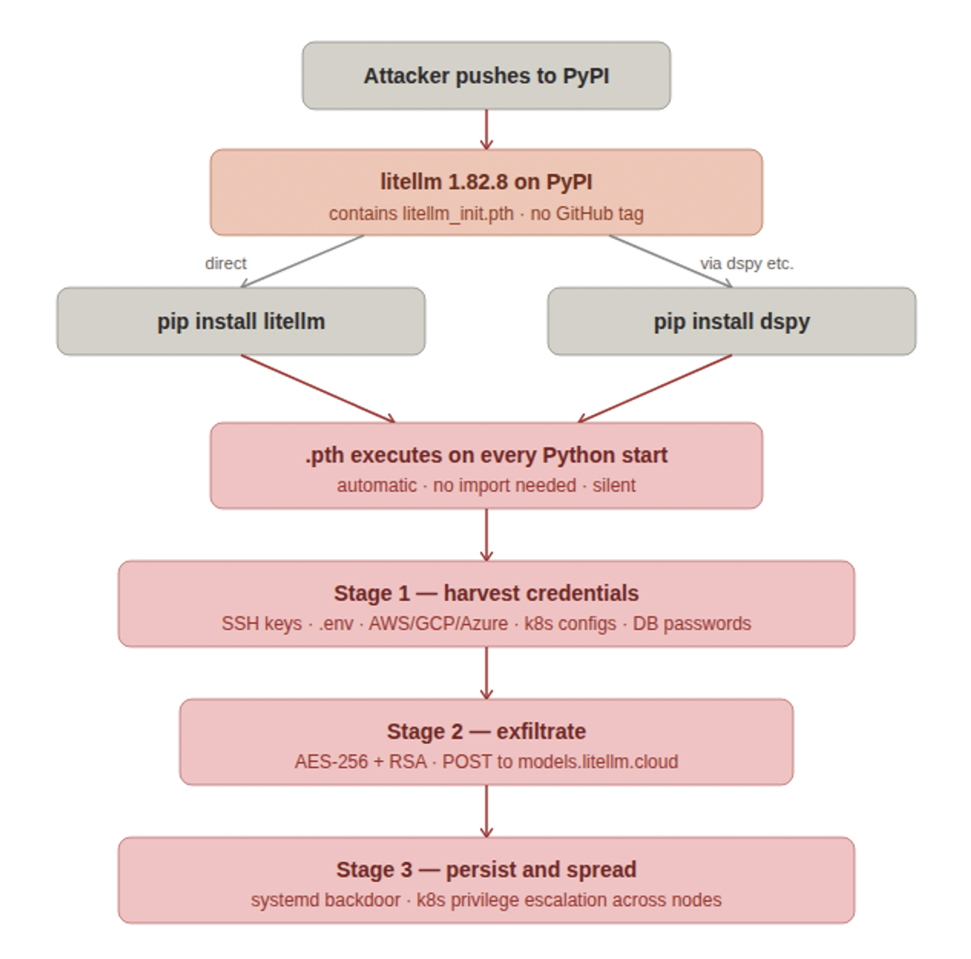 Figure 1: The three-stage attack chain, from PyPI upload through direct and transitive installs to credential harvest, exfiltration, and Kubernetes persistence.