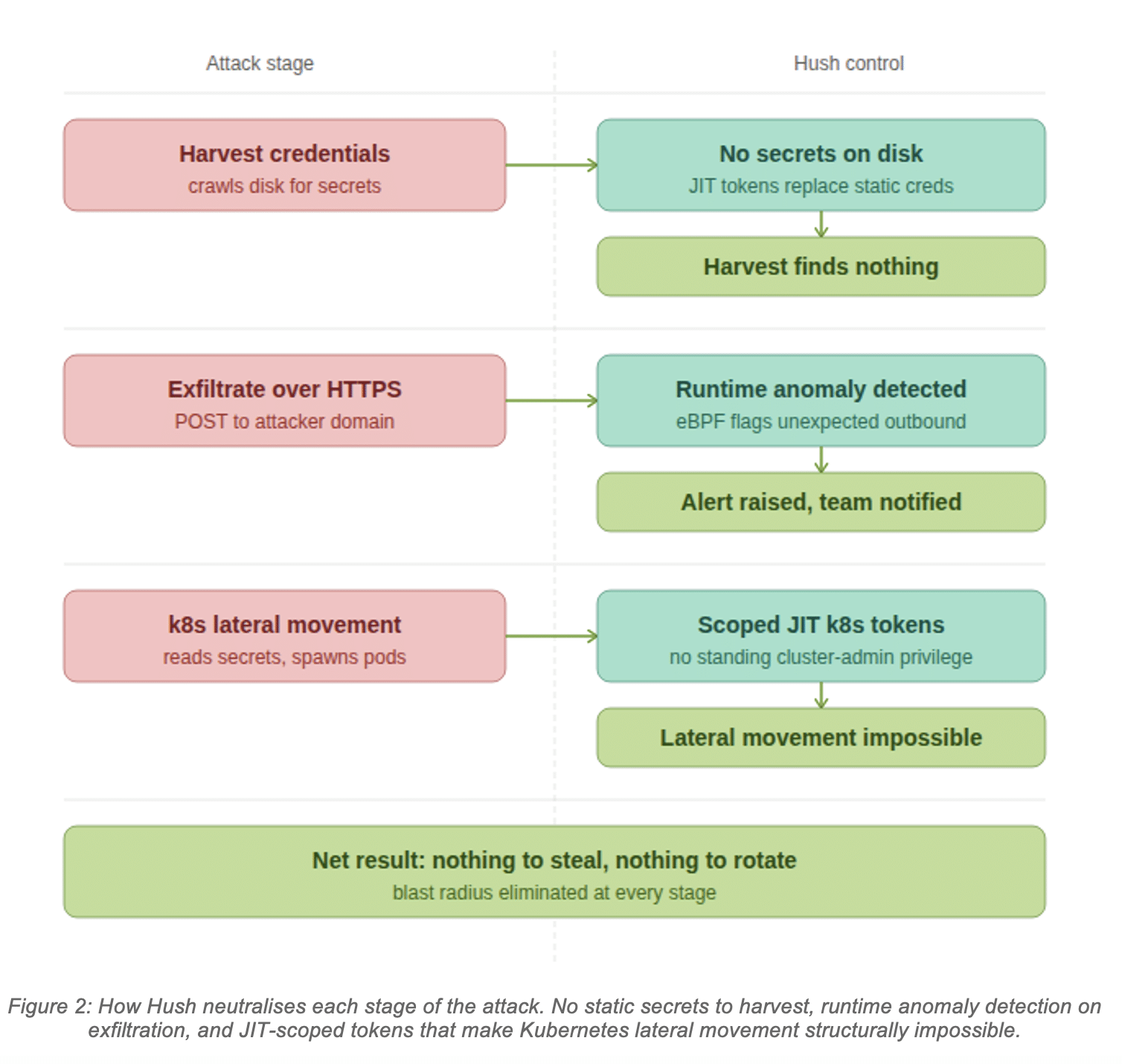 Figure 2: How Hush neutralises each stage of the attack. No static secrets to harvest, runtime anomaly detection on exfiltration, and JIT-scoped tokens that make Kubernetes lateral movement structurally impossible.
