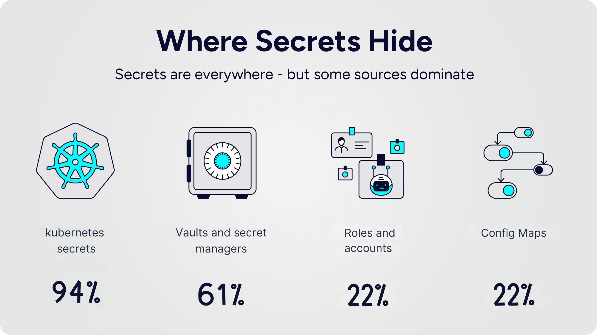 The data shows Kubernetes sits at the center of the problem. Workloads overwhelmingly lean on environment variables, while vaults and secret managers are layered on top. Instead of solving the problem, this combination multiplies it: more systems, more secrets, more risk.